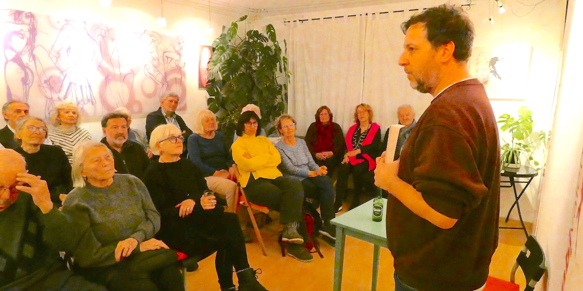 Glatter geht´s nicht mehr, nicht nur auf der Straße, auch bei DUNKEL NAH ist alles glatt gegangen! Das Glatteis hat weder Roman Klementovoc noch die Gäste abhalten, ins Kulturkabinett zu kommen. Dort war es kuschelig warm, die Lesung spannend, Romans Zwischeng´schichterln launig. Daher war auch die zweite „Halbzeit“ sehr gemütlich und familiär. VEROs Bilder waren das Tüpferl auf dem I und machten den Abend zun Gesamtkunstwerk.